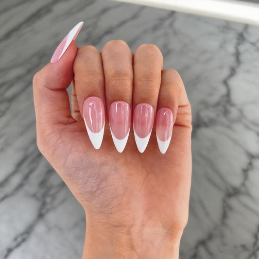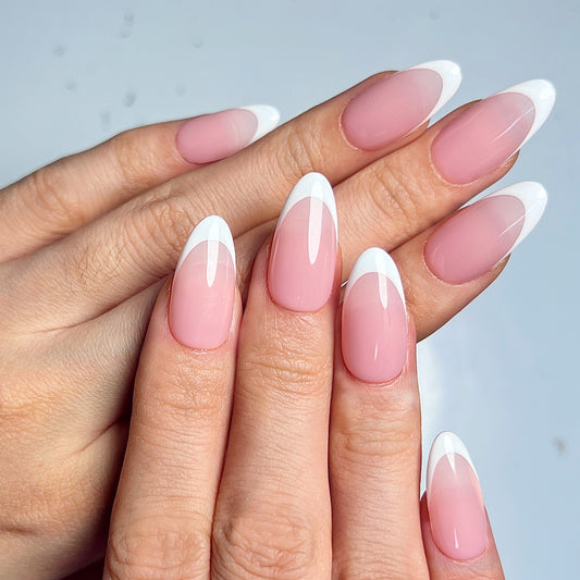 Nude&Pink Long Almond-Lulou Classic White French Tip Press On Nails Glueless Easy Apply Reusable 10PCS - Salon Quality Glueless Fake Nails for Women Trend 2025