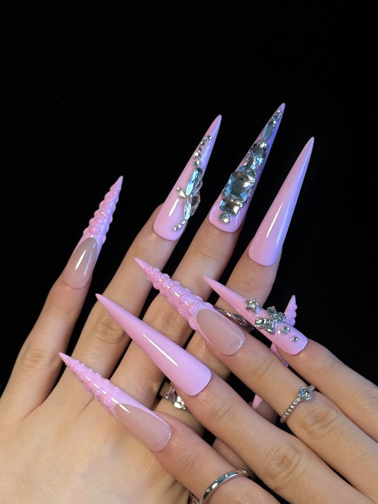 Lulou Candy Queen Crystal Long Stiletto Nails Glitter Pink Rhinestone Handmade Acrylic 10PCS Trend 2025