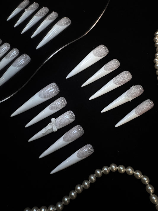Lulou Balletcore Lace Long Stiletto Fake Nails White 10PCS REUSABLE Handmade Acrylic Press On Nails Elegant 3D Design Trend 2025