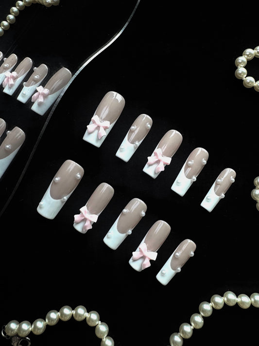 Lulou Sweet Bow French Elegant long square False Nails Pink & White 10PCS REUSABLE Handmade Acrylic Press On Nails Cute Design Trend 2025