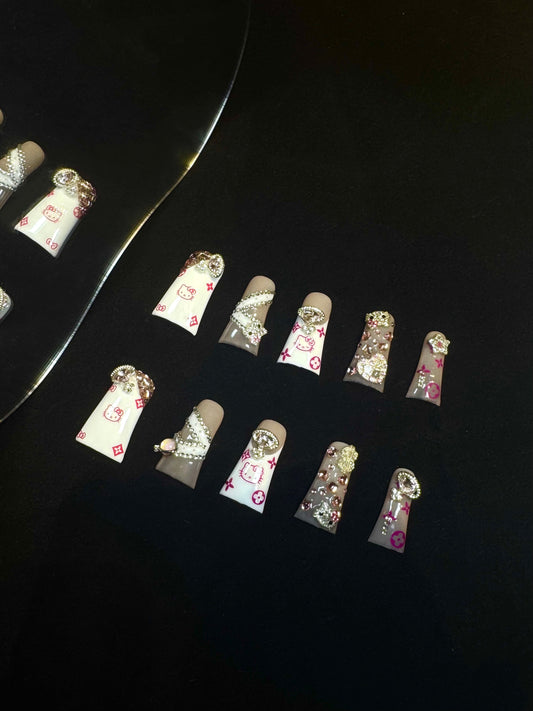 Lulou Love Spark Long Duck Press on Nails Pink Hello Kitty Rhinestone Glam 10PCS REUSABLE Handmade Acrylic Fake Nails Dazzling Trend 2025