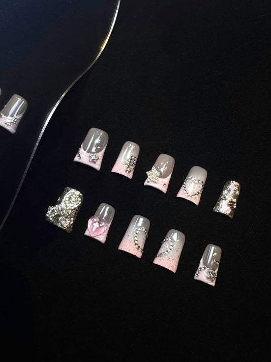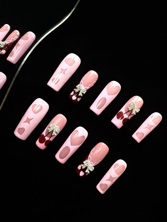 Lulou Bubble Pink Love Long Square Press On Nails Blush Hearts Handmade Acrylic 10PCS Trend 2025