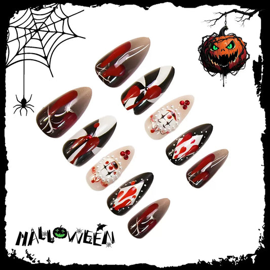 Lulou Bloody Masquerade Short Stiletto Press on Nails Red Black Glitter 24PCS REUSABLE Acrylic Fake Nails 3D Mask Halloween Trend 2025