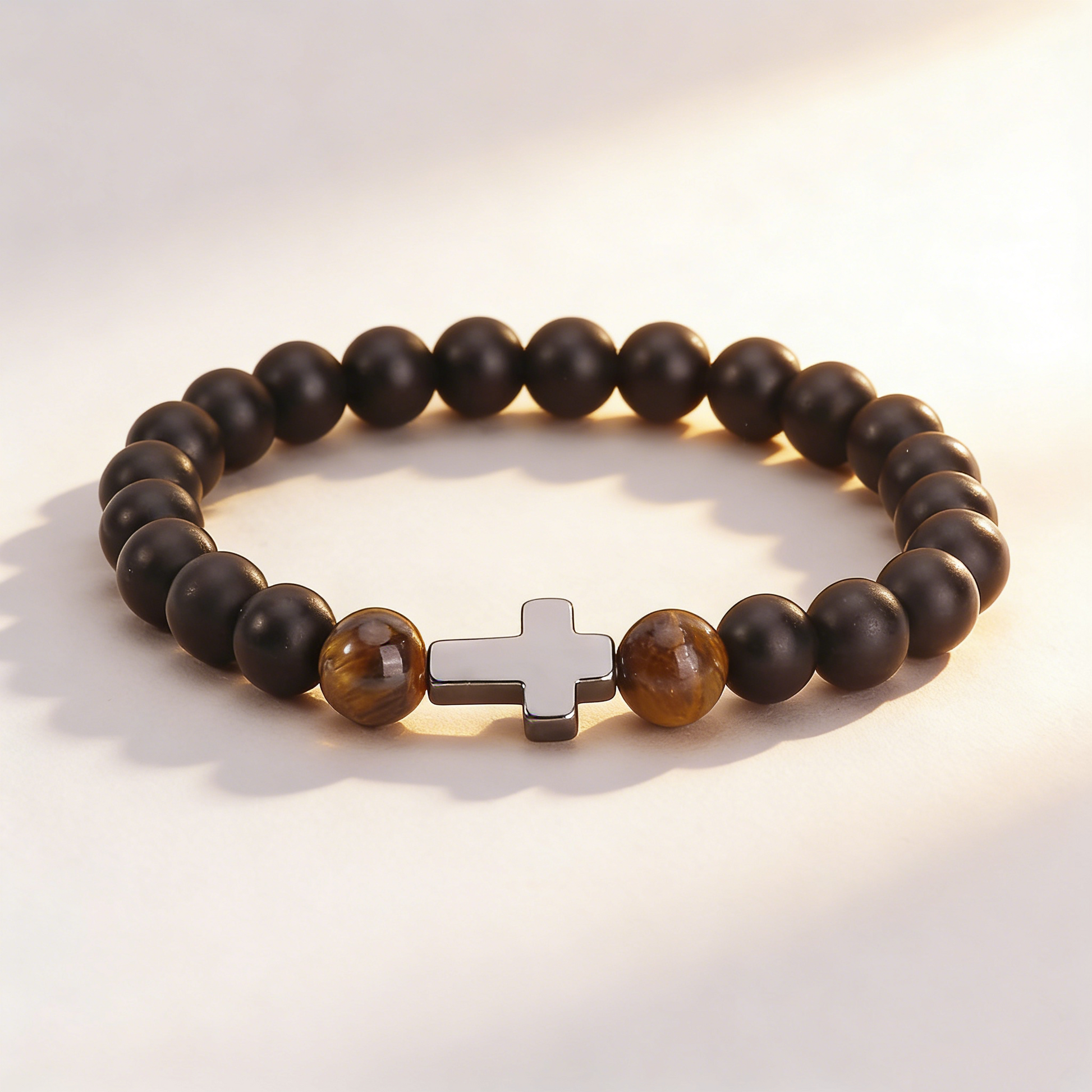 天然のマットブラックオブシディアンとタイガーアイストーンで作られた洗練されたビーズブレスレット。ポリッシュ加工された金属製のクロスチャームと伸縮性のあるバンドが特徴です。このユニセックスアイテムは、信仰と愛情をパートナーに伝えるための、意味のあるカップルギフトです。