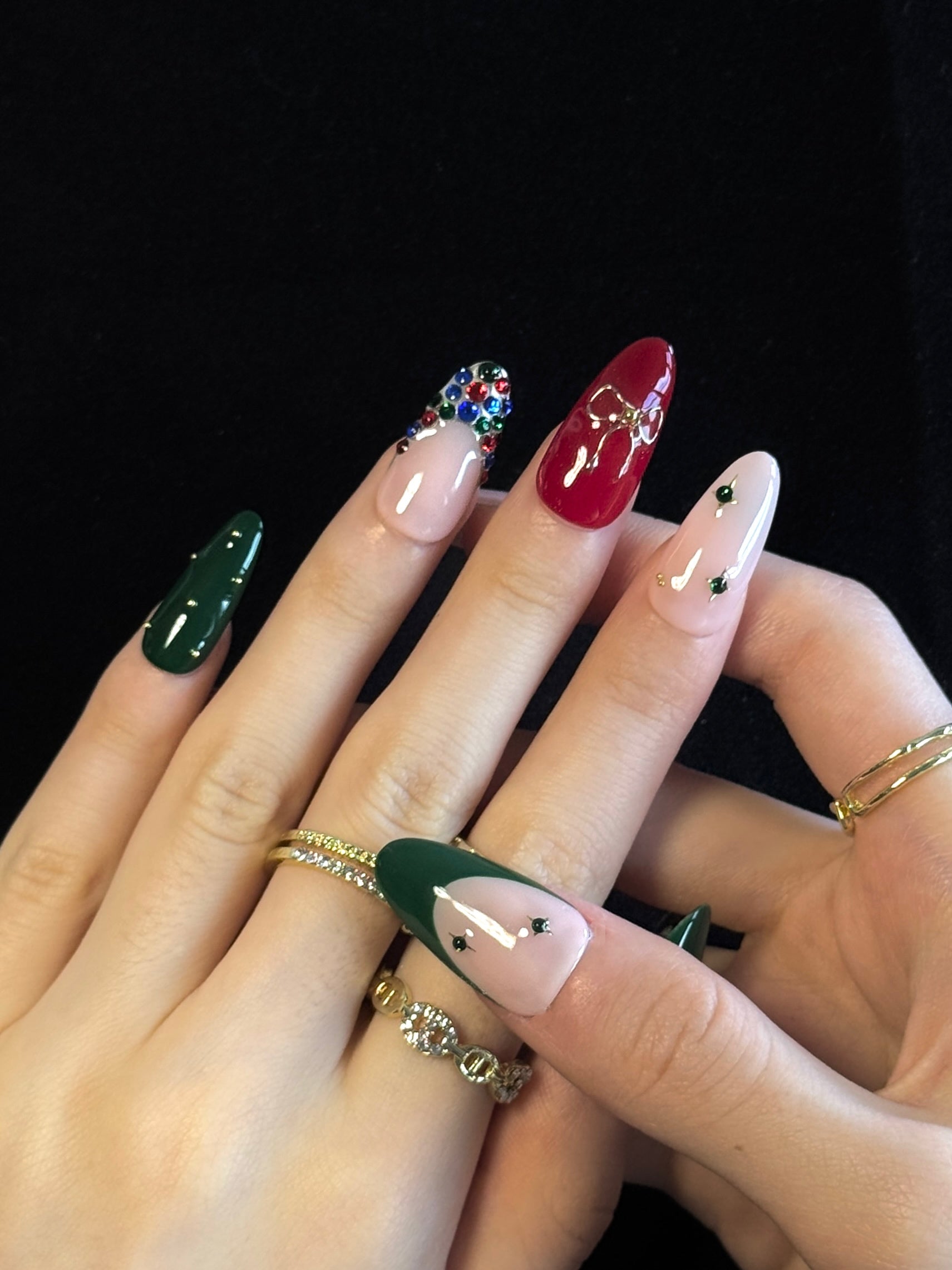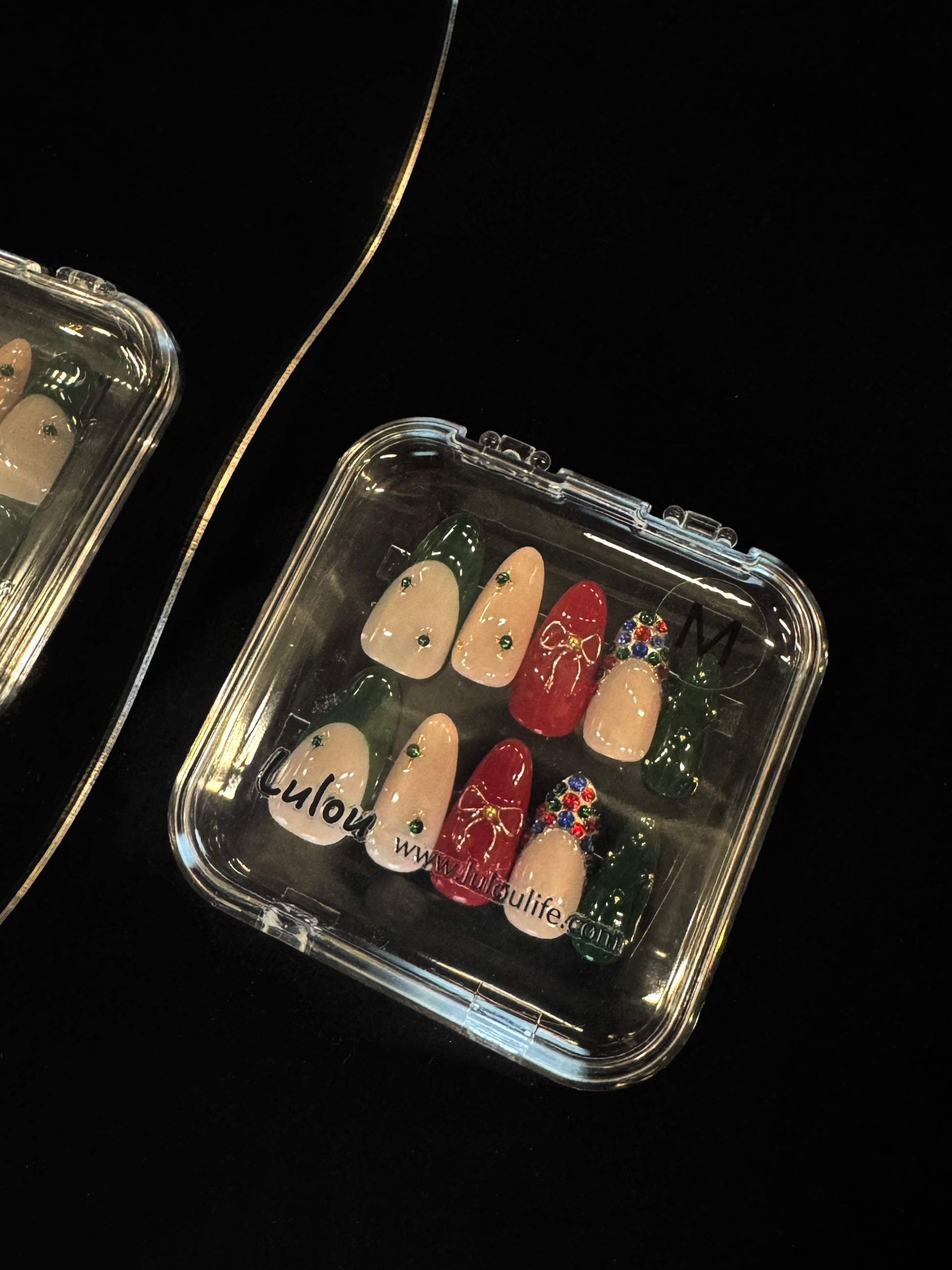 Lulou Berry Noel Long Oval Press On Nails Red Green Contrast Color Diamond Bow Embellishment Handmade Acrylic 10PCS Christmas Winter Holiday Trend 2025