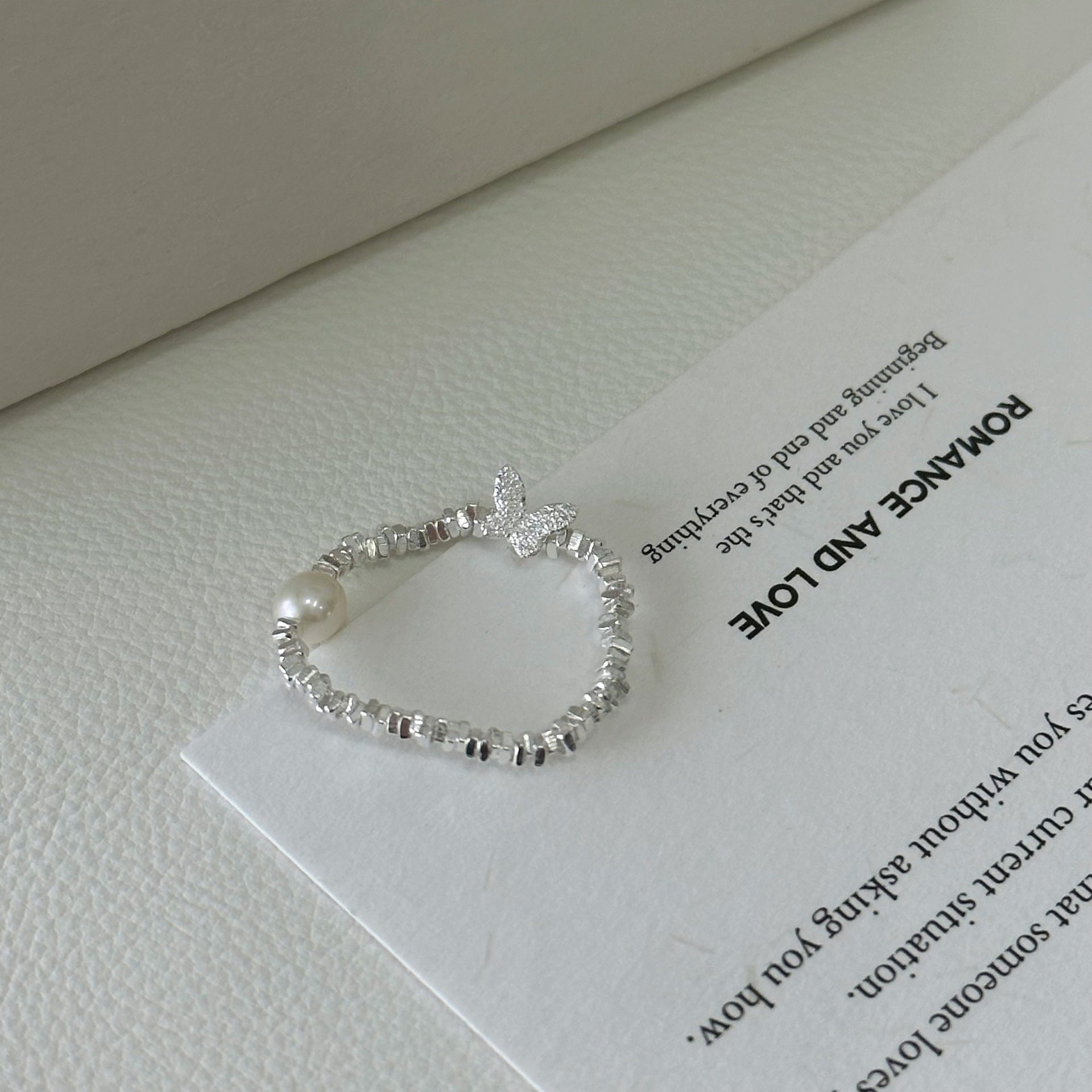 A delicate French minimalist ring featuring a shimmering crushed silver band, a sparkling butterfly charm, and a lustrous freshwater pearl accent. The stretchable design ensures a comfortable fit for most finger sizes, making it perfect for everyday wear or stacking with other rings to elevate your look.