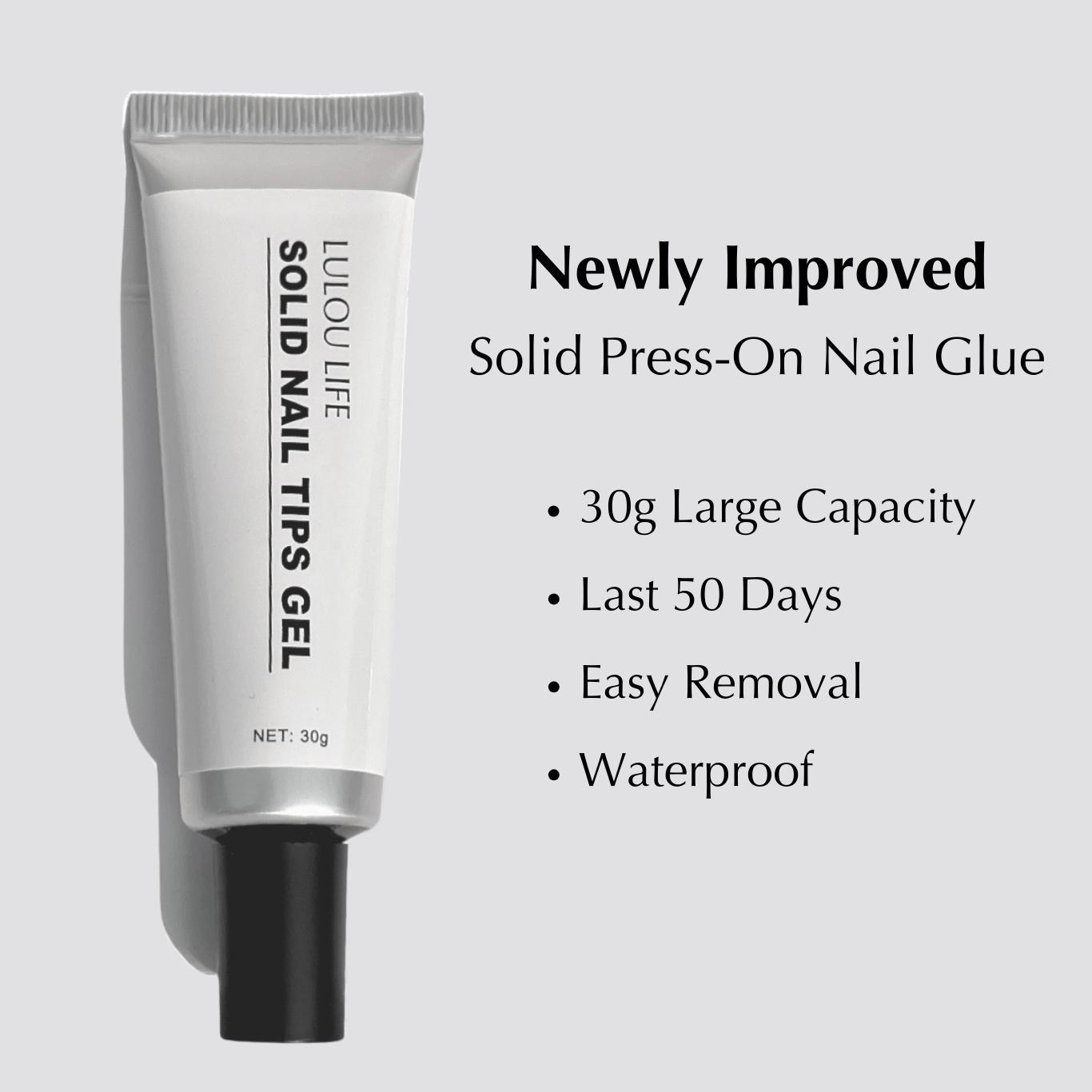 - STRONG & DURABLE. Lulou gel nail glue for press on nails comes in 30g. The multi-functional solid nail glue can be used to stick nail tips, press on nails, and also as rhinestone glue to stick sparkling diamonds and other cosmetic nail decorations. Mild and non damaging to nails, long-lasting for many days under fast curing lamp.