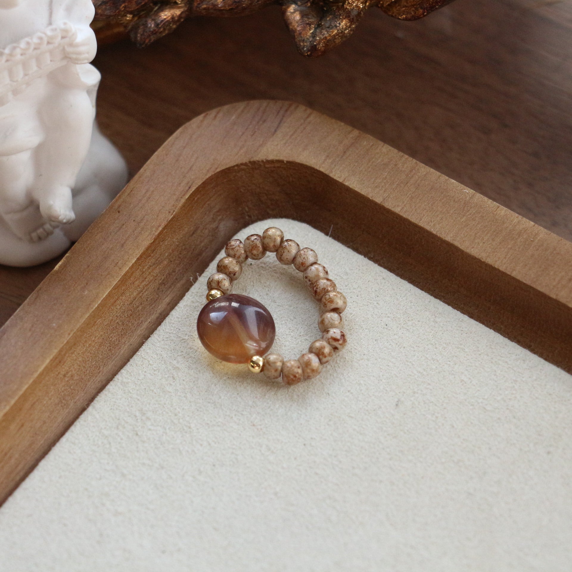 An organic beaded ring crafted from natural agate, tiger's eye, wooden beads and other natural stones, accented with gold-plated details. Its artistic, earthy design suits both partners, making it a meaningful couple gift for everyday wear.